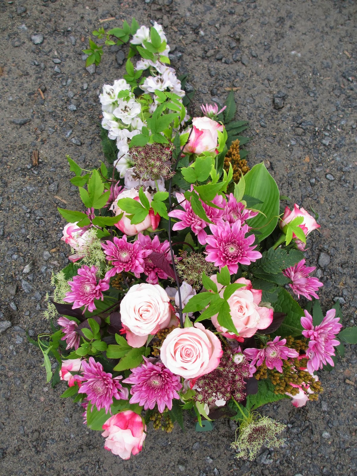 Minulla oli viimeinen floristin ammattitutkinnon tutkintotilaisuus viime joulukuussa, mutta en ole juuri kukkia käsissäni pidellyt sen jälkeen. Siksi työskentely oli vähän hakusessa ja aloitin varovaisesti -tekemäni surulaite jäi vähän kesken ja muotokin on vajaa, mutta materiaalin käyttö ja värien kuljettaminen läpi työn onnistui. Käytin työssä ruusuja, krysanteemia, jaloritarinkannusta, sudenporkkanaa, hortensiaa, kärhöä, nauhusta, kuunliljaa ja viitapihlaja-angervoa.
